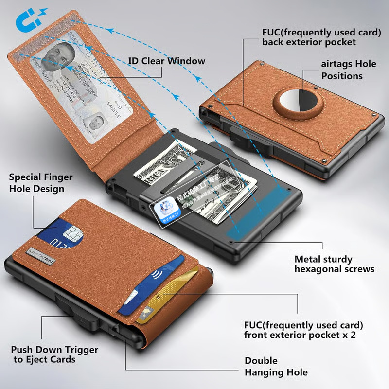 • 【MINIMALIST AIRTAG WALLET 】: We have chosen high quality materials for the wallet cover. Handmade high quality leather + carbon fiber texture.. The aluminum wallet chamber make of premium metal with a smooth eject pop up feature, using the latest ergonomic design, easy slide the side button of the metal wallet and get the neat pop-up cards.